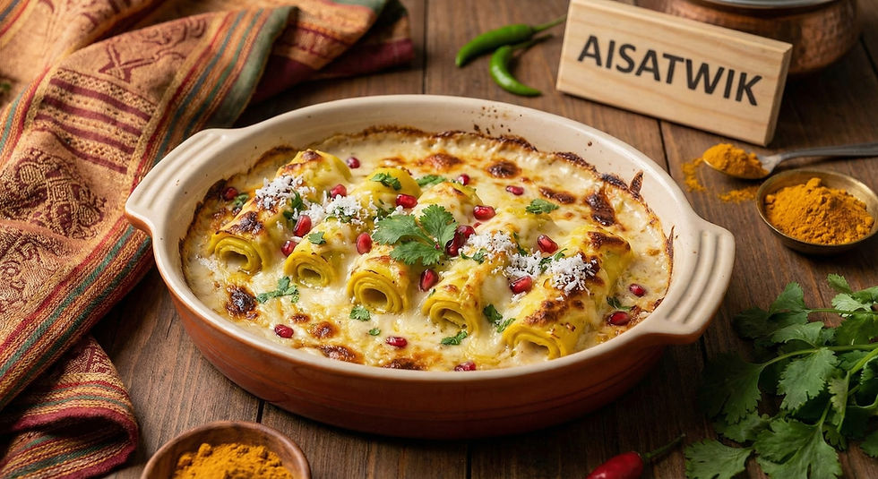 This dish bridges the gap between Gujarat and Italy. Khandvi (Patuli) is a 19th-century Gujarati snack made of gram flour and yogurt, known for its delicate, tight rolls. Cannelloni is an Italian cylindrical pasta served baked with a filling and sauce. This fusion uses the protein-rich chickpea flour sheets of Khandvi as a gluten-free pasta alternative, stuffed with a spinach-cheese filling and baked for a comforting finish.